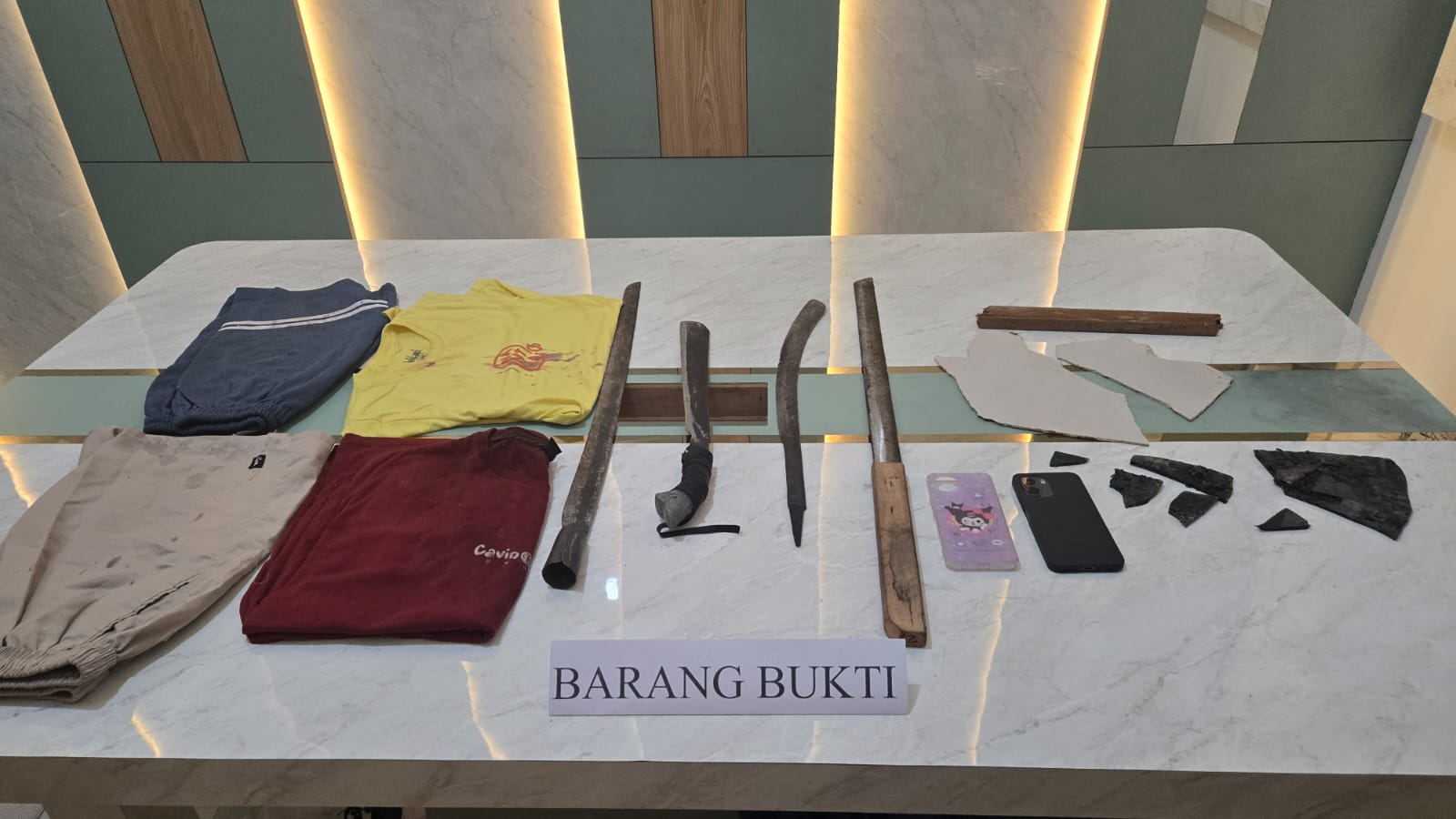 Selain mengamankan para terduga pelaku, polisi juga menyita sejumlah barang bukti berupa empat bilah parang, satu unit handphone, pecahan kaca, pecahan triplek, serta pakaian korban.
