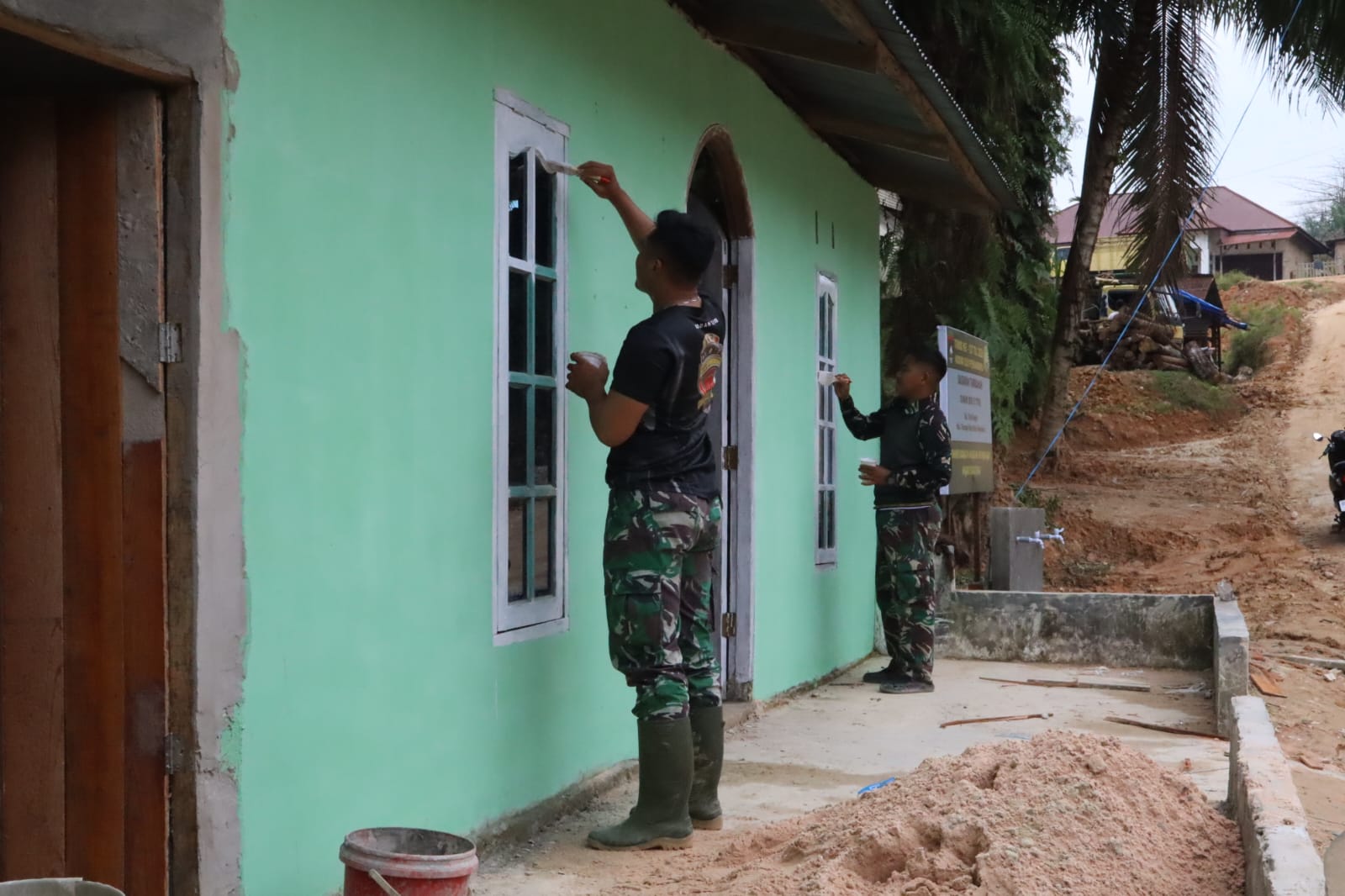 Sejak pagi, anggota Satgas TMMD bekerja bersama-sama menyelesaikan pengecatan. Kehadiran prajurit di lingkungan permukiman warga menciptakan suasana akrab. Warga yang melintas pun turut menyapa dan memberikan dukungan, mencerminkan kedekatan yang terjalin antara TNI dan masyarakat.