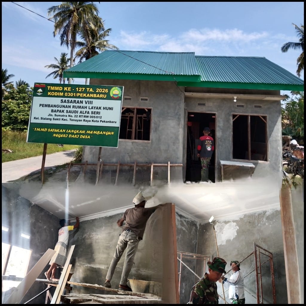 PEKANBARU,ARGOTERKINI.COM-Program TNI Manunggal Membangun Desa (TMMD) ke-127 yang dilaksanakan Satgas TMMD Kodim 0301/Pekanbaru terus menunjukkan progres signifikan. Kali ini, pembangunan Rumah Tidak Layak Huni (RTLH) milik Bapak Saudi Alfa Seri (45), warga Jalan Sumatra Nomor 22 RT/RW 005/012, Kelurahan Sialang Sakti, Kecamatan Tenayan Raya, Kota Pekanbaru, telah mencapai 83 persen, Senin (2/3/2026).