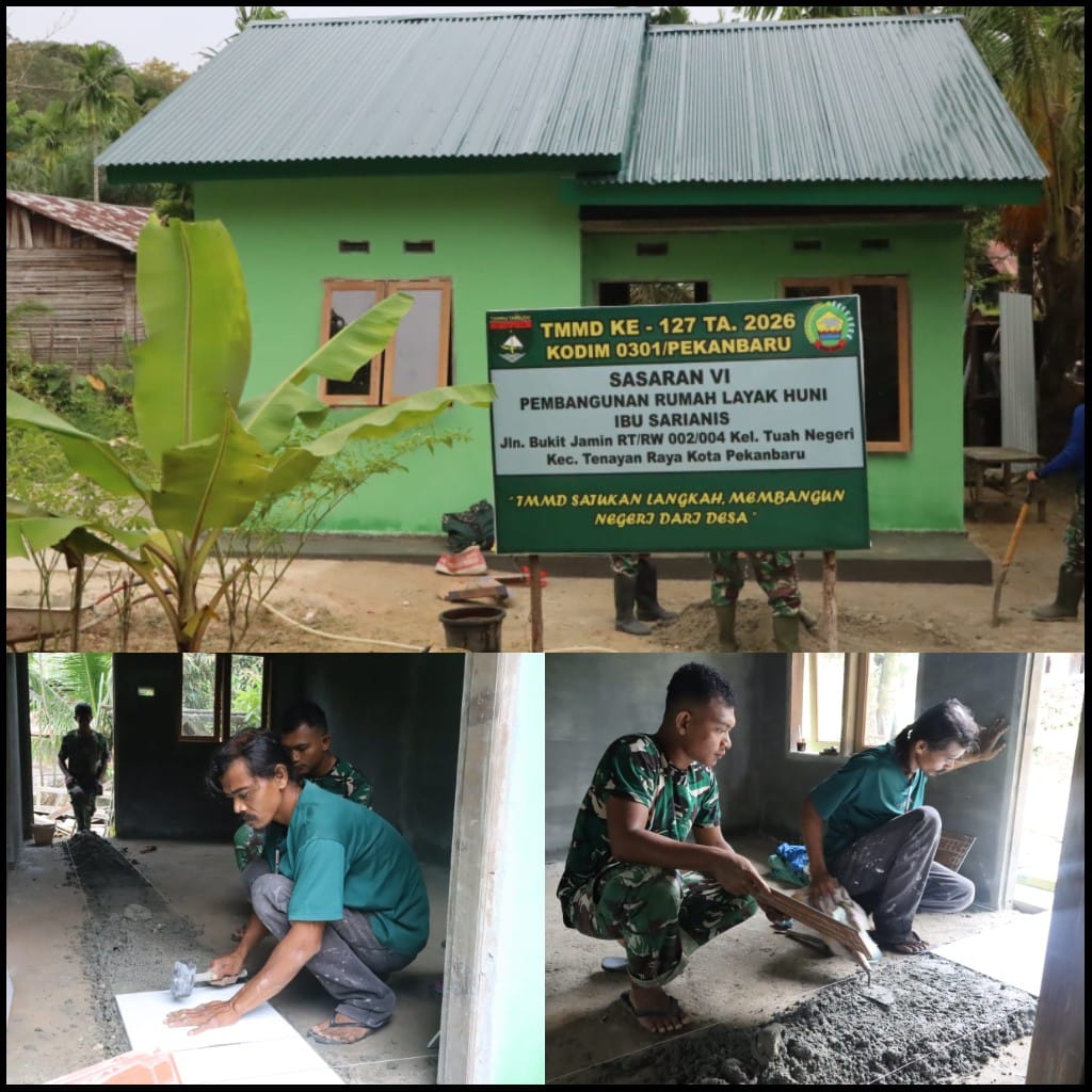 PEKANBARU – ARGOTERKINI.COM-Di bawah semangat kebersamaan dan kepedulian terhadap masyarakat, Satgas TMMD ke-127 Kodim 0301/Pekanbaru terus menunjukkan komitmennya dalam membantu warga melalui program pembangunan Rumah Tidak Layak Huni (RTLH). Salah satu sasaran yang kini hampir rampung adalah rumah milik Ibu Sarianis (58), yang beralamat di Jalan Bukit Jamin RT/RW 002/004, Kelurahan Tuah Negeri, Kecamatan Tenayan Raya, Kota Pekanbaru, Kamis (5/3/2026).