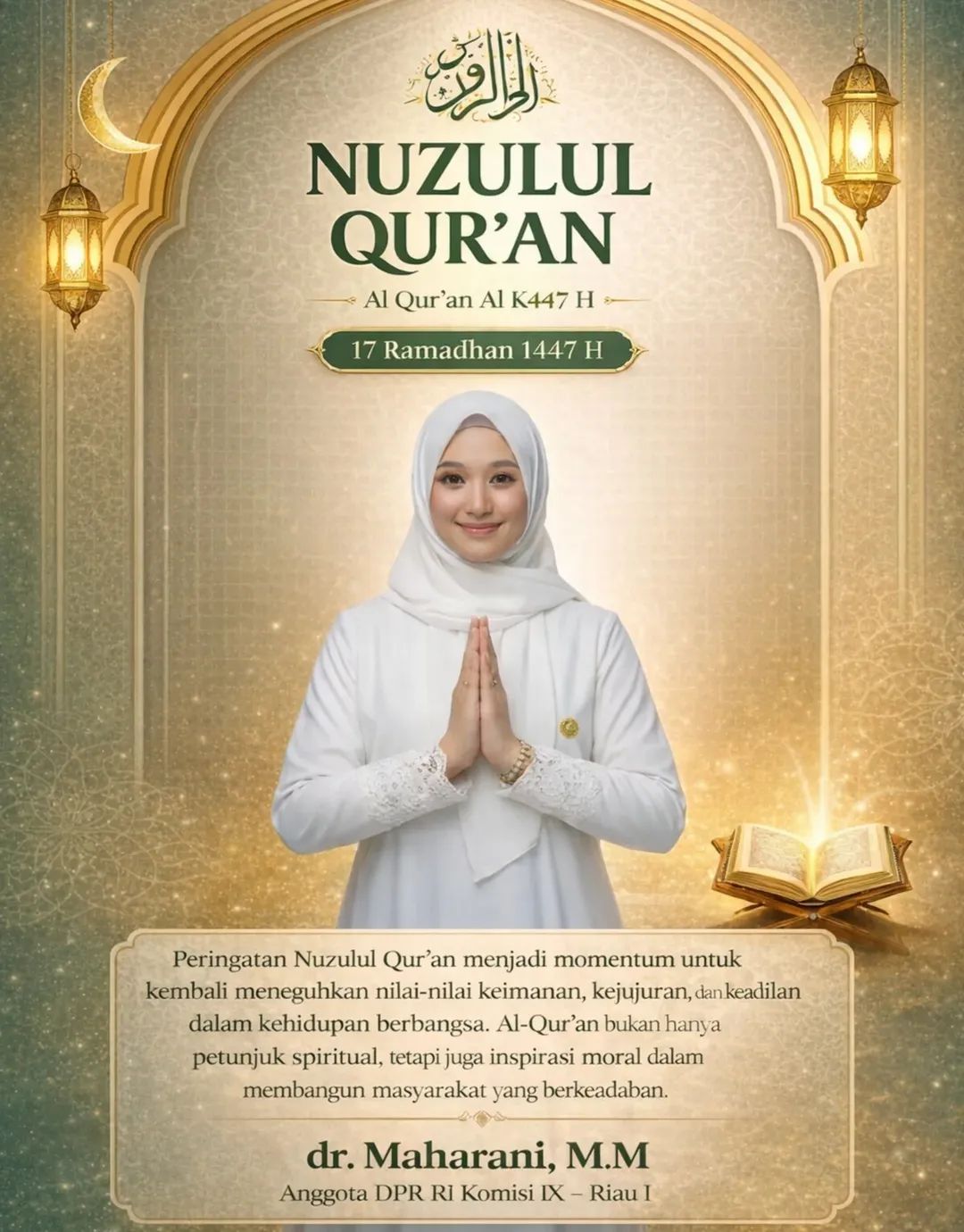 JAKARTA – ARGOTERKINI.COM-Anggota DPR RI Komisi IX Daerah Pemilihan Riau I, dr. Maharani, M.M, menyampaikan pesan refleksi dalam momentum Malam Nuzulul Qur’an yang diperingati umat Islam pada bulan suci Ramadan. Ia mengajak masyarakat menjadikan peringatan turunnya Al-Qur’an sebagai penguat nilai keimanan sekaligus pedoman dalam kehidupan berbangsa dan bernegara.