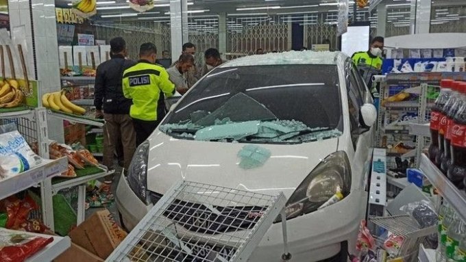 Mobil tersebut yang berada di parkiran langsung menabrak Indomaret yang berada di depannya yang menyebabkan kaca toko pecah.