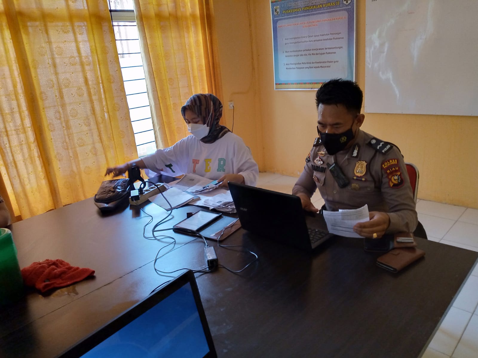 Argoterkini.com – Kapolsek Pangkalan Kuras, AKP A. Chandra Pietama mengerahkan sejumlah personilnya untuk membantu input data vaksinasi di dua Puskesmas setempat.