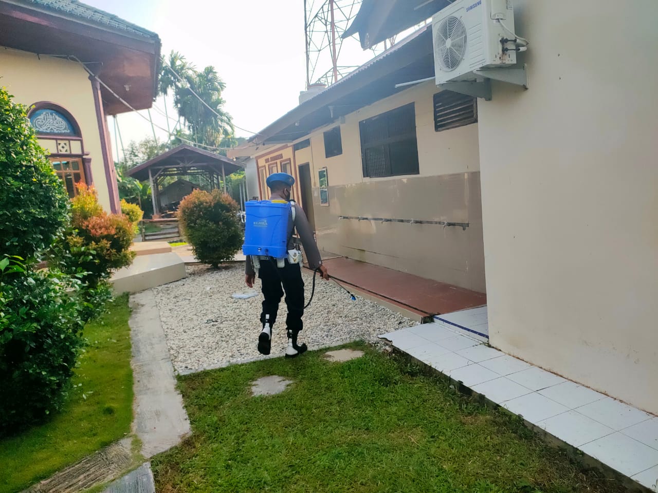 Argoterkini.com – Polsek Pangkalan Kuras, jajaran Polres Pelalawan, rutin melakukan penyemprotan disinfektan di Mako dan Asrama Polsek Pangkalan Kuras, Jumat (31/11/2021).