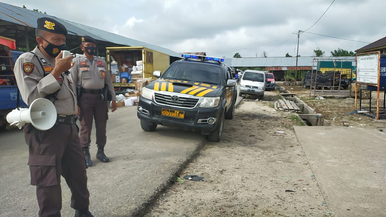 Dalam himbauannya, petugas mengimbau masyarakat untuk mematuhi aturan protokol kesehatan (Prokes) di pusat keramaian pasar.