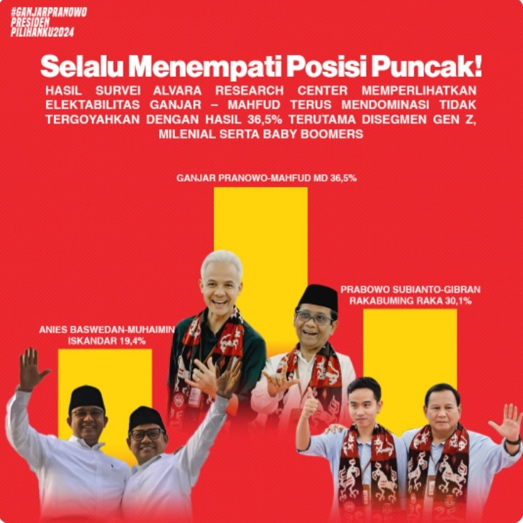 Argoterkini.com, Yogyakarta – Pada Pemilihan Presiden 2024, ada satu nama yang terus mengukir prestasi dan mendominasi dalam hati masyarakat Indonesia. Hasil survei terbaru dari Alvara Research Center memperlihatkan bahwa Ganjar Pranowo dan Mahfud Md memimpin dengan elektabilitas mencengangkan sebesar 36,5%.